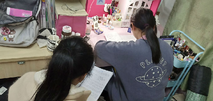 瞧!大家在辅导“老师”的带领下认真学习。有朋友的陪伴,再难的题也不会觉得枯燥,再远的路也不觉得漫长,再曲折的路也不觉得艰难,。在“1+1”的模式下,被督促的同学有了前进的动力,就算偶尔出现懈怠的情况也会被督促着学习,秉着不给同学添麻烦的原则,当他们想要中断学习的时候会坚持下去,孜孜不倦,奋发图强。举个真实事例,护理的课程是比较多的。但是因为这个学习小组的成立,在我们一天要上九节课的情况下,南北区来回穿梭,下课后回到宿舍依然会坚持刷题。