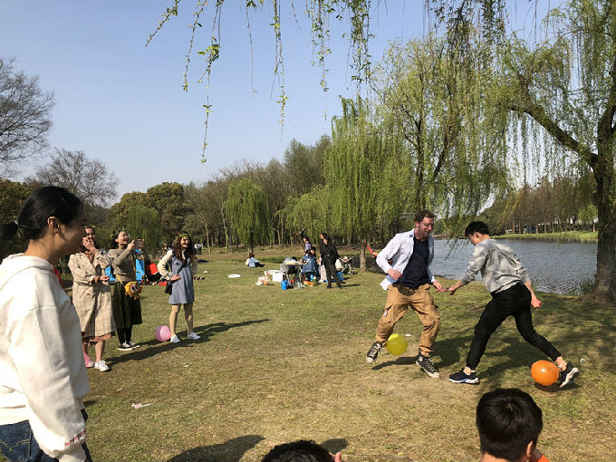 同学们与外教围坐一起,谈中英文化差异,增长见闻;亲近自然,感受大自然的美好。踏青怎能少了游戏互动环节?同学们与外教一起每人脚上绑一个气球进行游戏比拼,煞是有趣。