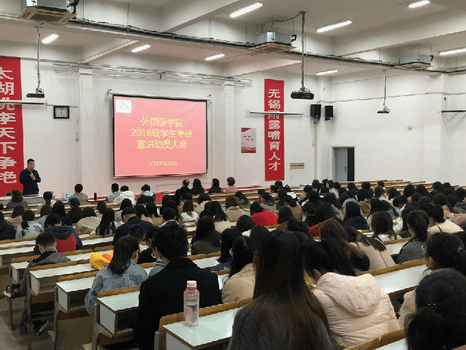 4月2日晚,外国语学院于七号楼成功举办“外国语学院2016级学生考研动员大会”。本次大会由外国语学院党总支副书记俞昊波主持,外国语学院院长包通法、副院长刘荔、吴旻昊及各系主任、辅导员一同参加本次大会。