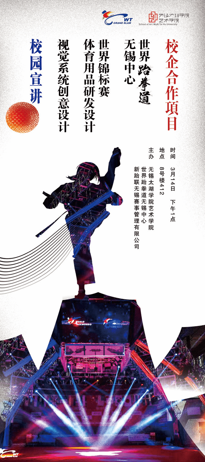 随后,世界跆拳道锦标赛无锡中心代表上台向与会师生介绍了跆拳道这一世界级赛事的现状以及在无锡今后的发展方向,并对本次宣讲会所涉及的世界锦标赛体育用品研发设计和视觉系统创意设计两大设计需求进行了详细说明。