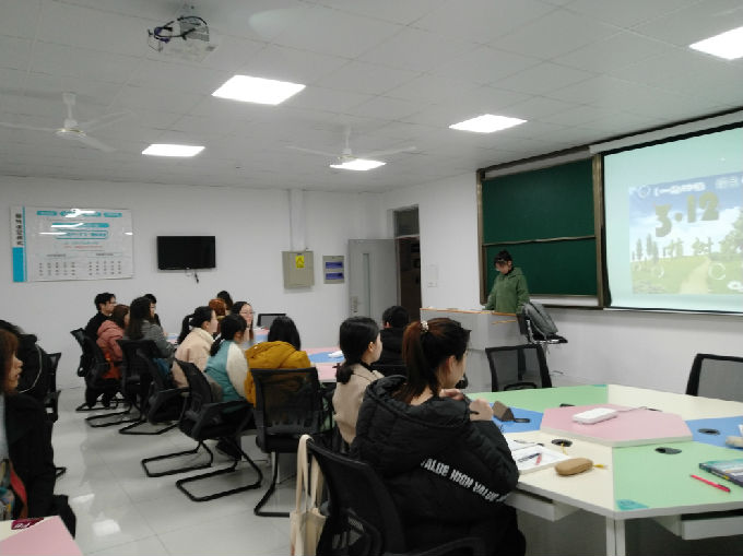 3、团支书为大家讲解植树节节徽的设计理念:树形,表示全民义务植树3至5棵,人人动手,绿化祖国大地。“植树节”表示改造自然,造福人类,年年植树、坚忍不拔的决心。五棵树可会意为“森林”由此引伸连接着外圈,显示着绿化祖国,实现以森林为主体的自然生态体系的良性循环。