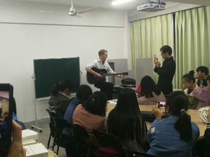 活动由Michael的自我介绍开场。特别的Michael给予我们特别的开场白。他的自我介绍的正确打开方式是猜谜。Michael在黑板上写下三件事情,其中一件事情是假的,其余两件事情是真的。让我们猜猜看,哪件事情是假的。冰雪聪明的我们一下子就猜到Michael出生于美国是假的。或许他不知道我们早就知道他来自英国。而且通过他的英式发音可以判断出。接着是同学们相互的交流,两两一组按照Michael的自我介绍方式向对方介绍自己。由此一来,促进大家开口说英语,同时也增进感情交流,借此机会认识不同的人,和不同的人打交道。听了大家的“三件事”,似乎,大家有共同的经历呢。有趣的是,一些同学的其中一件事情都是会说德语,或许是受Matt的影响,想到Matt就想到德语。然后,是精彩的才艺展示。一位漂亮的小萌新,用二胡为我们演奏一曲,二胡给人以沧桑之感却又扣人心弦。八年习得一专长,萌新的奏乐也向我们阐述坚持之道。结束之际,大家送上热烈的掌声表示感谢。Michael的吉他弹唱也赢得大家的欢心。表演之前,Michael先把歌词写在黑板上,给大家详细地分析句子的结构成分,讲解了生词的意思,帮助大家理解歌词。大致理解之后,Michael开始他的表演。独特的音色,浑厚的嗓音,Michael的歌声娓娓而来,仿佛在与一个活力四射的青春少年派对话。此时热烈的掌声传达的是我们被Michael的歌声深深的吸引住了,也感谢Michael教我们英文歌。最后最精彩的环节是默契大考验游戏。在场的同学被分成四组,两两PK。三名组员只能用英语阐述Michael写下的词,不能用中文和手势,另一名成员猜,得分最高组胜。在游戏的过程中,同学们再一次练习自己的口语,一定程度上锻炼了自己的表达能力和语言组织能力。小游戏大智慧,不亦乐乎。