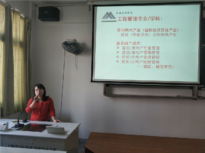 11月6日工程管理专业班主任方周妮老师介绍了工程管理这一学科,并指出今后的服务对象是针对于建筑、房地产两方面,并且对这两方面的行业、市场、企业、项目4大板块进行管理,以此阐述了今后同学们的就业前景。讲座期间,方周妮老师围绕工程法律、工程经济、工程管理、工程技术四个方向不断加强同学们对本专业深层次的了解,借此为工程管理专业的同学叙述了此后的学习方向。