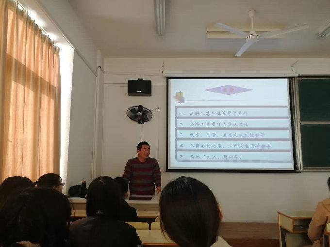 讲座开始,王发强老师首先向同学们简单地做了自我介绍,紧接着他向大家讲述本次讲座将从“公路项目实施过程,关键技术、质量、进度及成本控制,入岗后的心理、工作及生活辅导”三大方面展开,旨在系统地向同学们展示项目工程实施工作的基本流程。讲座中,王发强老师从对工程总体实施的研究、分析及决策开始讲起,分别以桥梁及路面为例为大家讲解了项目工程中的现场实施部分,同时结合实际案例为大家说明了技术、质量、进度及成本控制方面所存在的误区。最后王发强老师还通过开展互动问答环节,以提问的方式与同学们进行交流,让同学们留下了“疑惑”,带走了“知识”,使每一同学对“项目的实施过程”都有了正确的认知及深刻的了解。