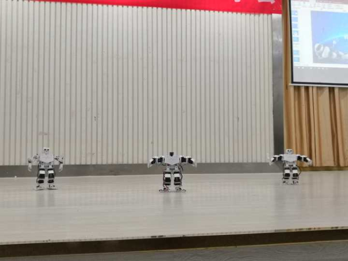 经验分享环节之后,就到了全场最期待的机器人舞蹈表演时间。三台最新的人形机器人一出场,便引得在场所有人惊叫连连。机器人经过协会成员的调试和编程后,伴随着动感的歌曲开始跳舞。看着三台机器人步伐一致、灵活地扭动着全身,在场的老师和同学们不停鼓掌欢呼。