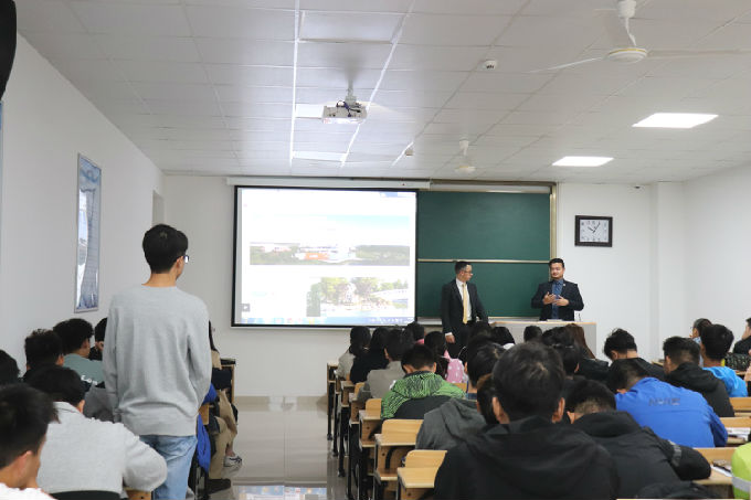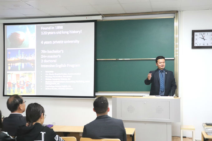 接着美国DBU国际事务部主任Micah Raies向在座同学们介绍美国德克萨斯州的达拉斯浸会大学。Micah Raies表示德州是具有巨大发展潜力的城市,2022年美国将开通三大城市高铁,其中一个城市就包括德州,并且德州机场飞机直飞城市也在逐渐增加,众多行业总部也位于达拉斯。达拉斯浸会大学拥有120年历史,2018年在全美排名202名。Micah Raies表示学校管理严格,拥有博士等级教授对学生进行授课,入学条件好等,许多美国名人及中国上海、深圳等南方城市名校领导都来自DBU毕业生。Micah Raies希望我们的同学在此锻炼自己的学习、工作、沟通等能力,毕业后可以陆续找到令人满意的工作岗位。