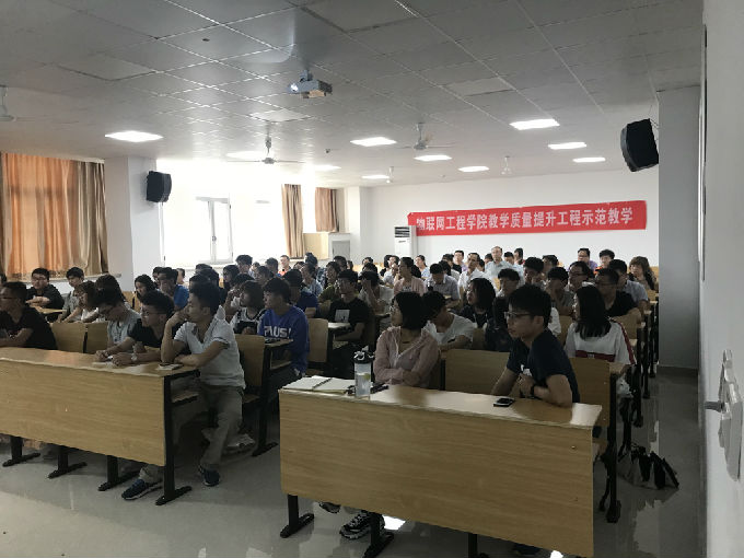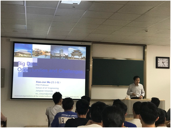 6月7日下午,江南大学科研院院长,二级教授博导,江苏省模式识别与计算智能工程试验室主任吴小俊博士来物联网工程学院作《大数据:机会与挑战》的专题讲座。这是beat365官网开展双语示范性教学示范课的重要活动。院长惠晶,副院长方宁生、李莎等领导以及物联网工程学院师生参加了讲座。