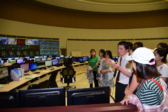 参观的首站是地铁的控制中心。控制大厅的巨大电子显示屏,显示所有地铁运行轨迹、客流量、重要位置的监控等。地铁运营公司调度票务部当班的值班主任为此行前去的学生代表讲解控制中心对整个地铁运行的重要性以及遇到突发事件所需要做的具体调动的操作,这使得同学们对地铁运行有了进一步的了解。在专业技术人员讲解的过程中,学生们了解到地铁集团经常有人来参观,而作为值班主任都需要会介绍讲解,如何深入浅出的用通俗易懂的语言和文字讲透讲清专业技术知识,一篇好的讲解词必不可少。