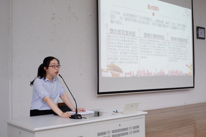 然后,许心怡老师向大家详细介绍了暑期三下乡社会实践活动的内涵、意义、主题以及总体思想等。许老师还着重从六个方面多个题目等形式对全体学生进行指导,她要求同学们结合自身专业和兴趣,充分发挥优势,自由组队。