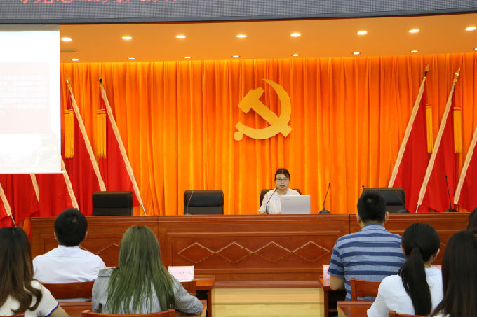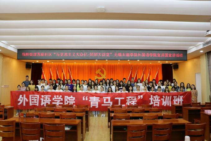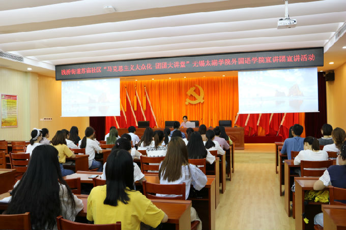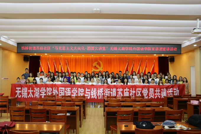 2018年6月7日,为响应学校党委提出的与社区党建大联动的号召,beat365官网外国语学院副院长吴旻昊、党总支副书记俞昊波、分团委书记许晓艳携手钱桥街道团工委副书记马俊、苏庙社区党总支副书记杜仲伟共同出席了“马克思主义大众化”团团大讲堂beat365在线唯一官网外国语学院宣讲团宣讲活动。这次活动也是外国语学院第二届青马工程培训班社会实践的一个环节。