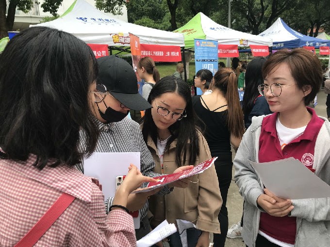 大四的学生们根据自己的专业和兴趣应聘相应岗位,各单位带来招聘的岗位分别有英语教师、语文教师、新媒体编辑、外贸专员、课程顾问、市场专员等共计100多个岗位。