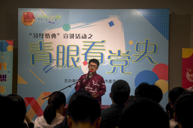 说书人为大家讲解了中共一大、二大相关的历史,让我们更加深入的了解了我们党成立初期的艰难历史。在说书结束后,主持人让我们大家谈谈对于习近平总书记新时代、新思想、新青年、新作为的理解,大家都踊跃发言。来自无锡科技职业学院的江老师上台发言,他说在新时代的大好形势下,我们应该清楚的审视自己,确定明确的目标,为祖国的未来发挥自己的力量。