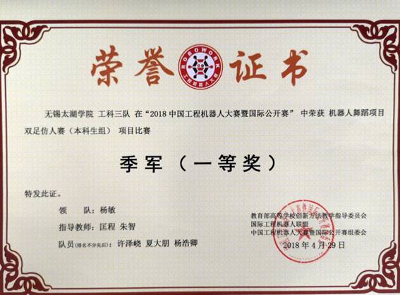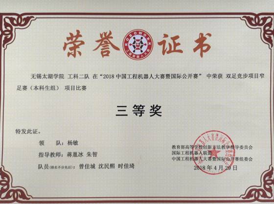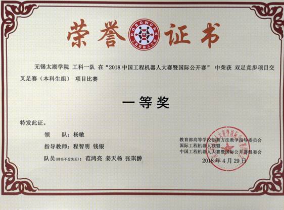 2018中国工程机器人大赛暨国际公开赛于4月25-29日,在湖北省武汉市中国地质大学举行。物联网工程学院派出的3支队伍全部获奖,其中两个国家一等奖、一个国家三等奖。本届大赛由教育部高等学校创新方法教学指导委员会、国家工程机器人联盟等单位联合举办。大赛包含机器人工程创新设计、人工智能、机器人搬运、机器人竞速、机器人竞技等18大项比赛,有29个省市自治区、355个单位的1858支代表队报名参赛,其中参赛教师2591人、参赛学生5186人,参赛学校、队伍及人数都为历年之最。