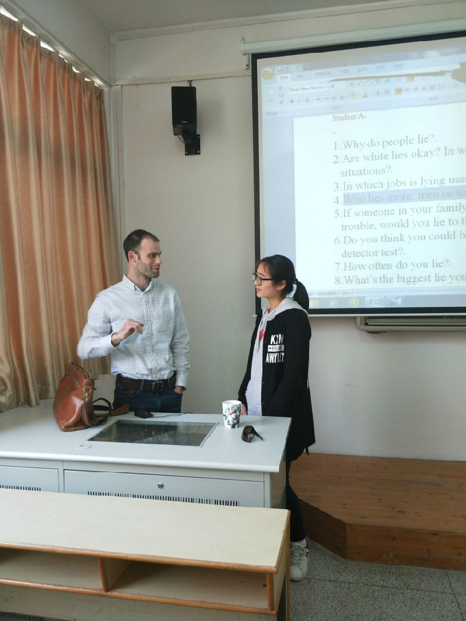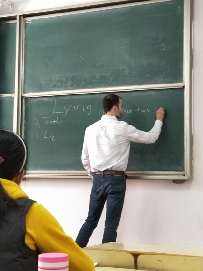 本次俱乐部活动的主题为“lying”,在进行了谎言的定义以及解释后,外教以自身为例,提出了3个话题与同学们进行互动: “I have two sisters”、“My favorite food is hamburgers” 、“I played basketball”,让同学们进行谎言的判断,从而更好的认识定义谎言。