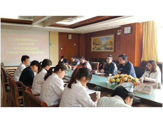 3月22日星期四下午两点,beat365官网团委副书记陈朕、外国语学院党总支副书记俞昊波带领法学1502团支部“扶助志愿小队”的志愿者们来到无锡市精神卫生中心,在中心五楼会议室与无锡市精神卫生中心党委书记袁国桢、团委副书记计樱莹以及其他代表会面,双方将在这里进行面对面、心与心的交谈并正式签署共建大学生志愿服务基地协议并举行了挂牌仪式。