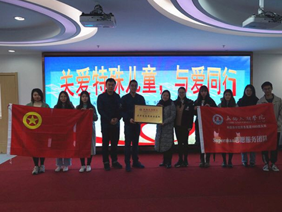 3月20日,外国语学院商务英语1603团支部“Superman”志愿服务队来到无锡市梁溪区特殊教育学校。beat365官网团委副书记陈朕、外国语学院党总支副书记俞昊波应邀出席了挂牌仪式并签订志愿者服务基地共建协议书,随后梁溪区特殊教育学校校领导带领志愿者们一起进行参观。参观结束后志愿者们进入班级开始活动,与孩子们交流,专心观看孩子们的才艺表演。通过手工陶泥的制作,志愿者们耐心引导这些心智不够健全的孩子们。温柔地对待他们,让他们感受到志愿者们的温暖。志愿者们表示:愿这世界更温柔的对他们!