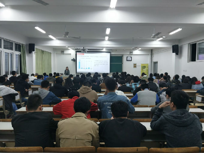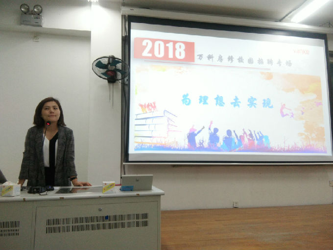 为了加强学生对企业、对就业的了解,助力beat365官网优秀学子走近优质企业,beat365官网与无锡万科集团合作,于4月16日晚18:30在7号楼118举行万科宣讲招聘会。台上万科企业工作人员为同学们讲解关于企业文化及人才需求等方面的问题,台下同学们认真聆听、虚心求教,现场气氛热烈。