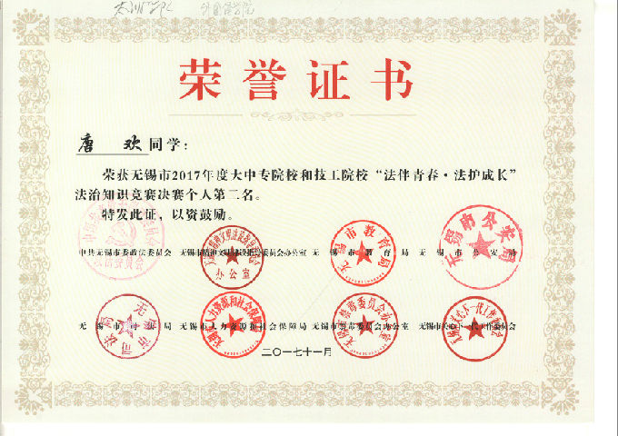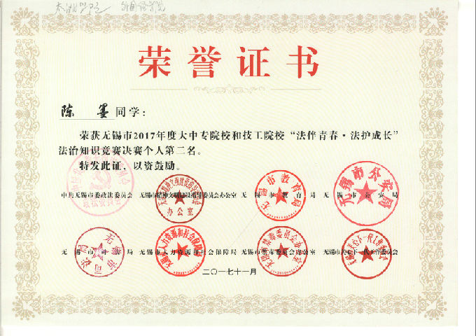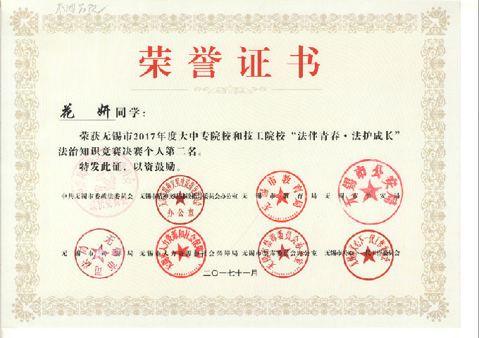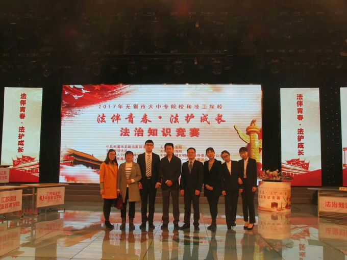 2017年12月1日,由市委政法委、公安局、司法局、教育局、人社局、文明办、禁毒办、关工委等八个单位,联合组织开展的全市大中专和技工院校学生法治知识竞赛决赛,在无锡市电视台拉开帷幕,来自全市7个代表队的21名学生,展开激烈角逐。