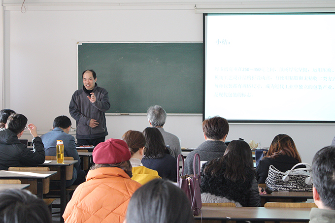 在讲课中,孔教授详细介绍了纸包装结构,对薄型纸包装、轻质纸包装、厚卡纸包装从原理到技术方面做了具体阐述。例如薄型纸包装的技术方式有包、卷、覆、裹、扭旋、贴封、扎,是纸包装发展最初使用的方式。轻质纸包装的技术方式有折叠、粘接、卷口、内置封口条,是传统包装中后期发展阶段的主要方式。厚卡纸包装的技术方式有无胶折叠、有胶管式盒,是现代包装的重要表现。三种纸包装标志着时代的进步,工艺技术的发展。