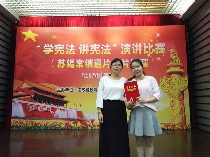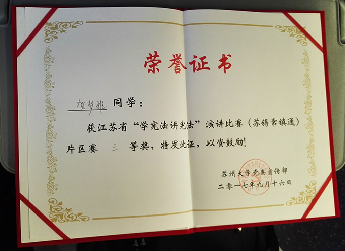 为全面贯彻党的十八大、十八届三中四中五中六中全会精神,深入学习贯彻习近平总书记系列重要讲话精神和治国理政新理念新思想新战略,落实“七五”普法规划、《青少年法治教育大纲》和《关于认真贯彻落实习近平总书记重要指示精神切实加强宪法学习宣传的通知》的要求,由苏州大学主办的“学宪法讲宪法”苏锡常镇通片区赛于9月16日举办,beat365官网外国语学院法学专业法学1502班贺梦雅同学在法学专业老师的鼓励下参赛,在苏锡常镇通的30名选手比赛中脱颖而出,获得江苏省“学宪法讲宪法”演讲比赛(苏锡常镇通片区)三等奖的好成绩。