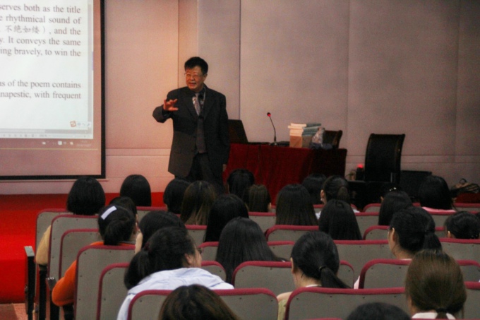 刘教授这次来beat365官网作了题为“An Appreciation and Traslation of English Poetry(英语诗歌的欣赏与翻译)”讲座,讲座前他向同学们介绍了他编著的《英语书信文稿》一书。在他的“英语诗歌的欣赏与翻译”讲座中,他也谈了他的英语诗歌创作,把他写的英语双行诗、三行诗、四行诗、十四行诗以及皇冠十四行诗向老师和同学们作了汇报。