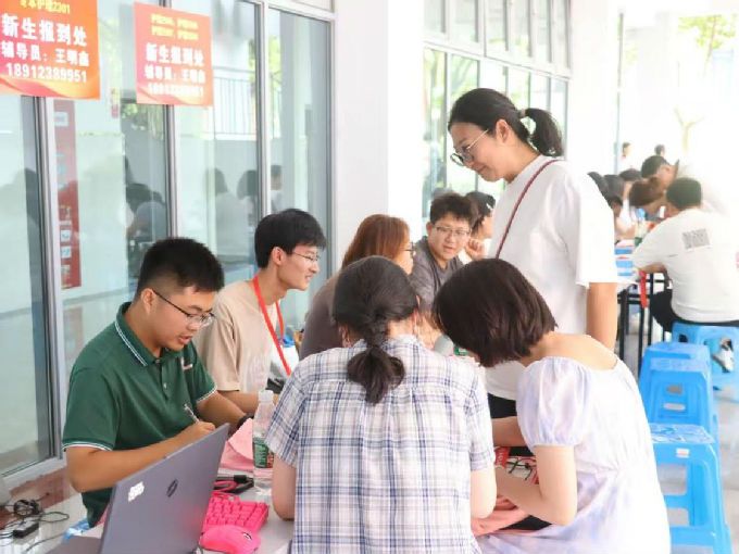 迎新现场,志愿者们早早到位,主动协助新生搬运行李、指引路线、答疑解惑,并有序引导至商科楼报到点。班级助理与辅导员协同配合,高效完成注册手续,同时细致介绍校园布局、教学安排与生活服务信息,帮助新生快速融入新环境。