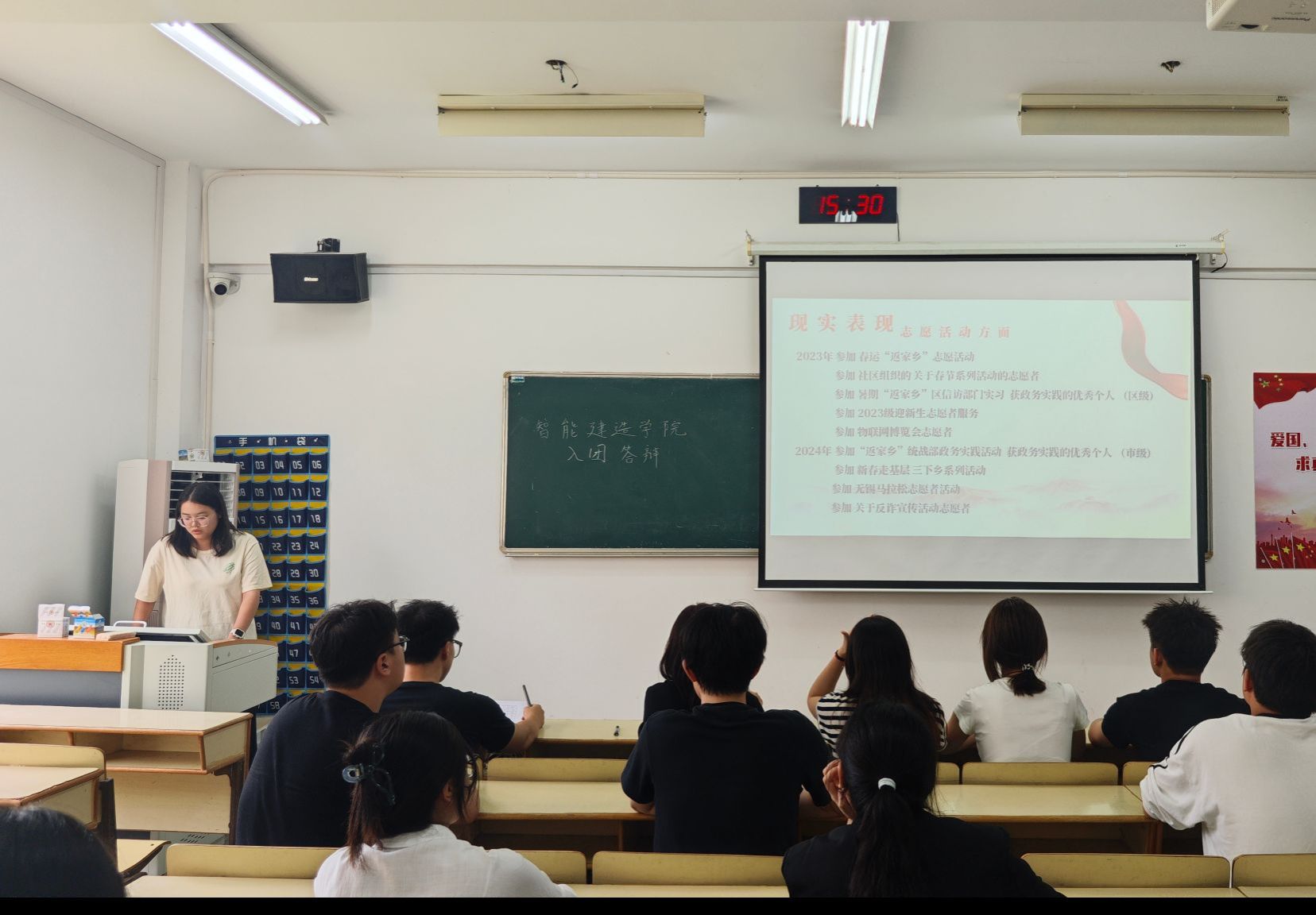 答辩伊始,胡深老师首先阐明了入团答辩的重要意义与流程。他强调,入团答辩不仅是对同学们理论知识、思想觉悟的检验,更是对其入党初心、服务意识的深度考察,希望各位同学能借此机会展现真实的自我,明确入团后的责任与方向。随后,答辩正式开始,各位拟入团积极分子依次上台,围绕对共青团的认识、入团动机、个人思想、学习情况以及未来规划等方面进行阐述,并结合自身参与志愿服务、学科竞赛、班级工作的经历,分享了在实践中践行青春担当的感悟。