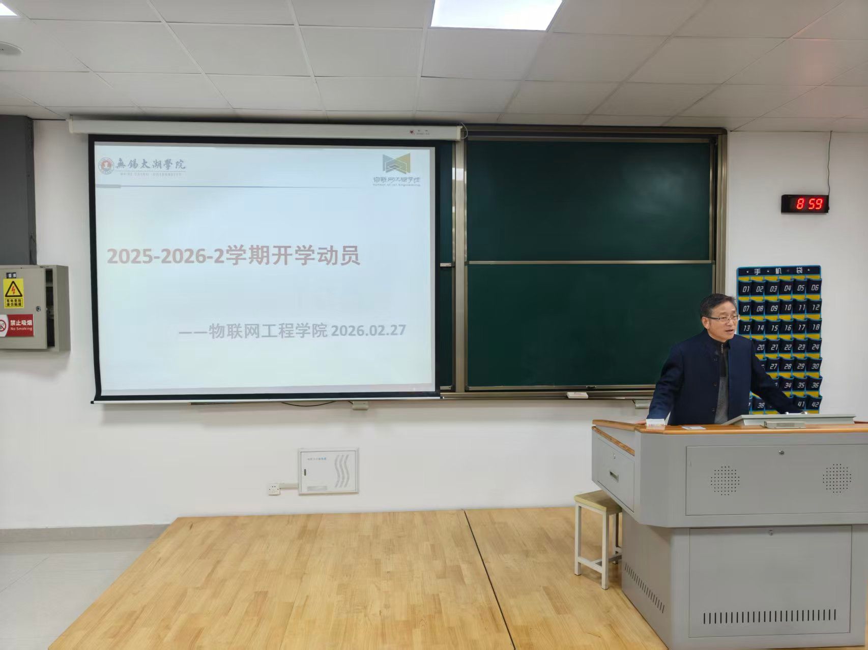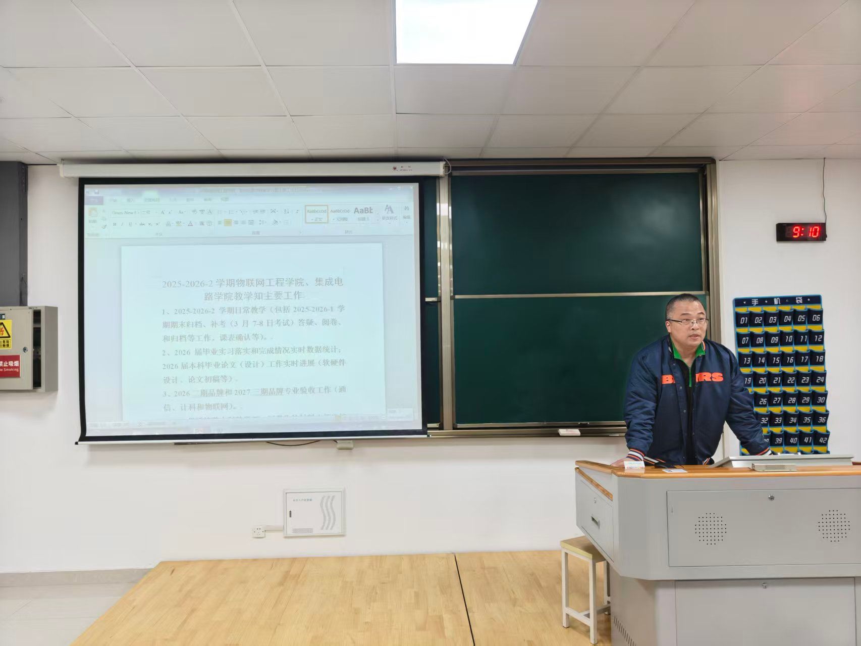 为统一思想、明确任务、压实责任,确保新学期各项工作开好局、起好步,近日,物联网工程学院召开新学期动员大会。学院常务副院长成本茂、党总支副书记沈峰、副院长王华君、副院长尹嵘出席会议,全体教职工参加。会上,学院领导班子成员依次结合分管领域,对新学期重点工作进行全面部署与安排。首先,常务副院长成本茂全面部署新学期学院整体发展与行政运行工作,明确新学期发展目标与重点任务,统筹推进学科建设、人才培养、师资队伍、...