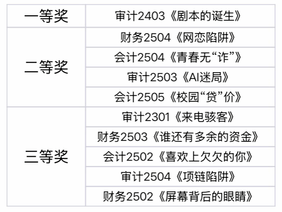 本次大赛共有17支队伍参加。会计2508班以《别让“馅饼”变陷阱》为题,重点警示同学们警惕“低投入高回报”、刷单返利及校园网贷等骗局。会计2503班与财务2504班分别呈现《甜谎》与《网恋陷阱》,聚焦网络交友诈骗案例,深刻传达了“网恋需审慎,恋爱要防骗”的核心主旨。审计2503班推出情景剧《AI迷局》,紧扣高科技新型诈骗模式,生动演绎了现代化诈骗套路,有效提升了学生识别与防范新型骗局的能力。财务2502班《屏幕背后的眼睛》讲述了受骗者在他人鼓励下迷途知返,并积极投身反诈宣传的励志故事,彰显了微光汇聚、守护平安的正能量。会计2408班《小满的反诈一课》则针对兼职求职骗局进行深度揭露,告诫同学在求职择业时需严谨甄别,务必通过正规平台应聘。