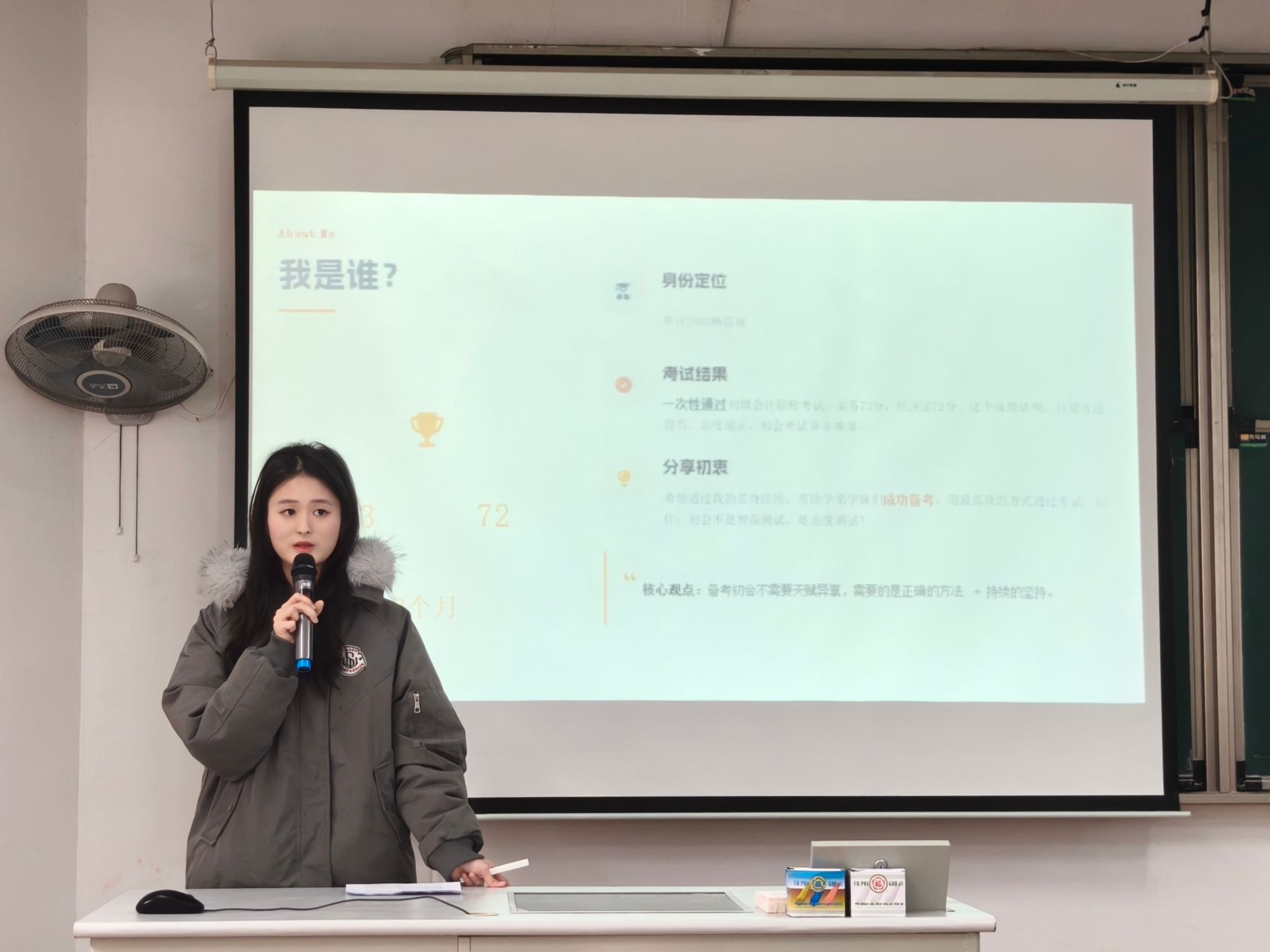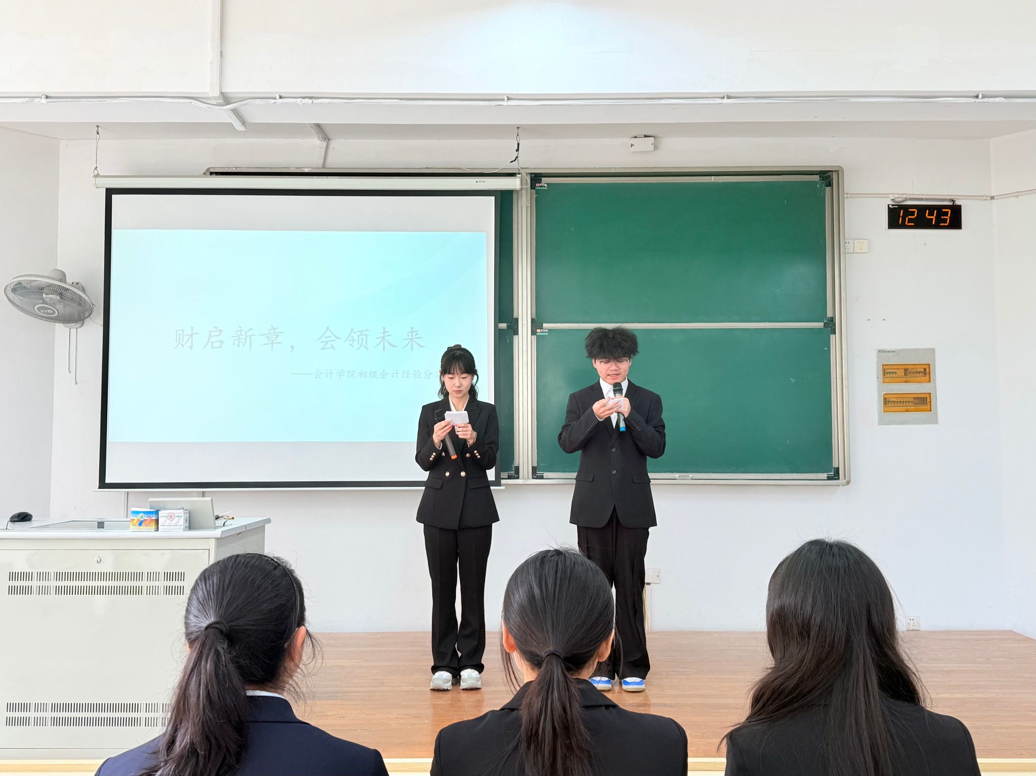 在经验分享环节中,会计2405的刘雅晴同学以“稳住,我们能赢”的积极心态展开分享,系统梳理了初级会计两门考试科目的核心考点分布,并依托练习与答题经验,分享了实用的答题思路与应试技巧。审计2403杨晨雨同学则从考试考核内容、分数突破技巧、学习时间管理、考场实战经验等多个维度,全面分享了科学高效的备考方法,为同学们制定备考计划、提升复习效率提供了清晰参考。