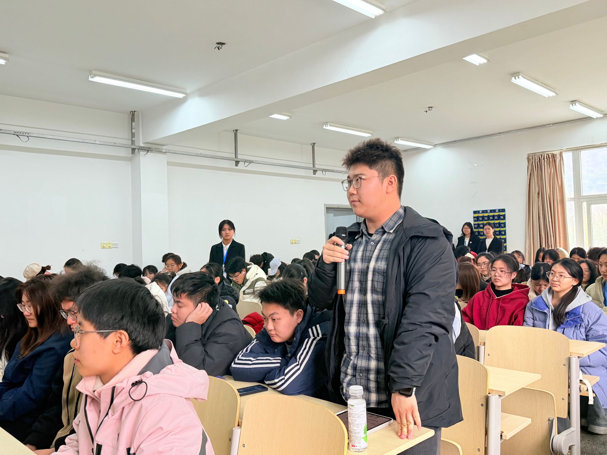 随后在答疑环节中,两位优秀学生代表通过随机抽取疑问箱中的问题便签,结合现场同学提出的疑问展开互动交流。针对“备考资料推荐”“基础薄弱如何备考”“时间规划与复习安排”等同学们普遍关心的问题,两位优秀学生代表逐一进行细致分析与耐心解答,基于自身经验给出具体可行的建议,帮助大家进一步理清备考思路,明确学习方向与复习路径。