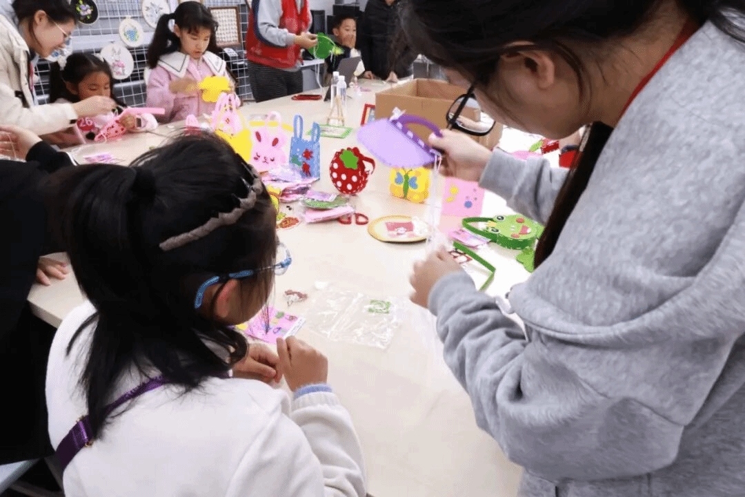 本次活动依托学院专业特色与社团资源,设置了多样化的非遗手工体验板块,为参与学生打造沉浸式艺术实践平台。学院毅志艺行志愿服务工作室牵头开展非遗漆扇体验与手工DIY挎包制作活动,工作室志愿者们提前筹备材料,现场细致讲解非遗漆扇的文化内涵,手把手引导孩子们调色、晕染、盖章,在扇面上尽情晕染出斑斓色彩,体验传统工艺的独特魅力;在手工DIY挎包环节,学生们自主设计图案、搭配装饰,志愿者们协助小朋友们完成穿针引线、简易缝制等步骤,孩子们在一针一线间体会手作乐趣,收获属于自己的创意小挎包。小朋友们看着精美的成品纷纷向同伴和家长展示,脸上满是自豪与喜悦。
