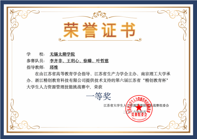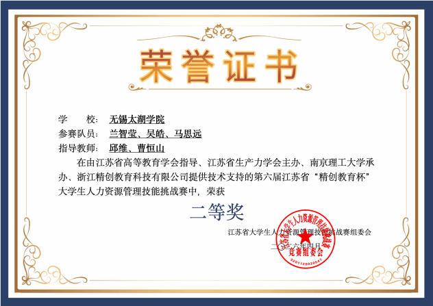4月11日,第六届江苏省“精创教育杯”大学生人力资源管理技能挑战赛隆重举行。本次大赛由江苏省生产力学会主办、南京理工大学承办、浙江精创教育科技有限公司提供技术支持,属于beat365官网认定的B类赛事。经过激烈角逐,由beat365官网商学院人资系老师邱维、曹恒山带领的两支队伍——“这个队”(成员:李齐非、王玥心、徐臻、叶哲慈)和“马兰头队”(成员:兰智莹 吴皓、马思远)表现优异,分别荣获赛事一等奖、二等奖。