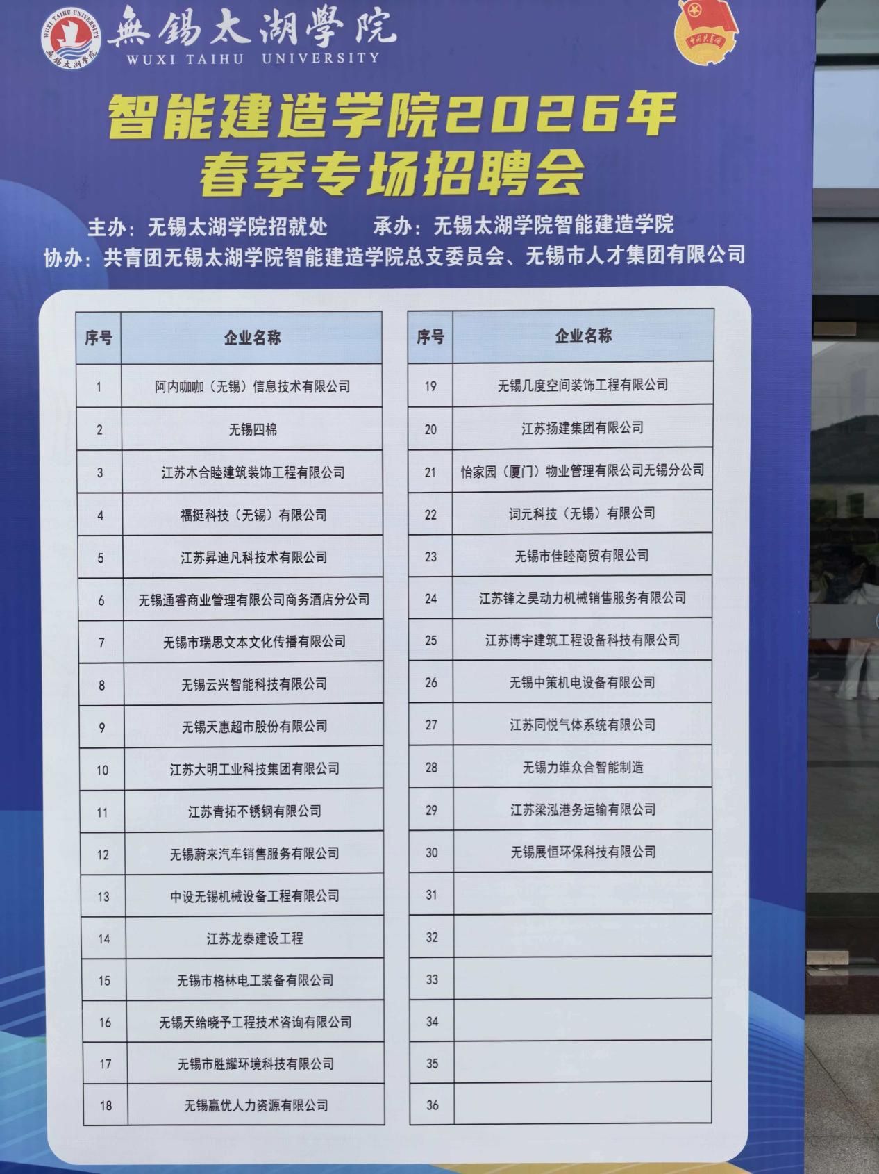 为抢抓春季就业关键期,持续推进学院2026届毕业生高质量就业,搭建校企精准对接桥梁,助力毕业高质量充分就业。4月23日下午,智能建造学院在学校工科楼大厅举办2026届春季招聘会。本次活动紧扣建筑行业智能化发展趋势,聚焦毕业生就业核心需求,共汇聚无锡地区30家优质企业齐聚现场,为 2026届毕业生送上一场“家门口”的就业盛宴。