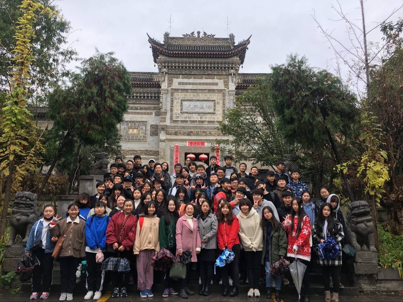 2018119日,亚欧语言文化学院应用日语专业17级全体学生,在两名老师的带队下,参观学习了《关中民俗艺术博物馆》。尽管当天寒风萧瑟、冬雨刺骨,但是我们的学生井然有序,仍旧怀着无比敬仰、感慨万千的心情,认真聆听讲解员的解说,不断做笔记记录、撑着雨伞抓拍外出见习的美好瞬间。见习中不断有学生问身边的老师:这个用日语怎么说?日本文化深受中国隋唐时期的影响,他们对这儿也一定感兴趣吧?学生们热情、好学的态度得到讲解员的一致好评!关中民俗艺术博物馆的三位解说员,纷纷主动要求和我们的学生合影留念,并说要把这些珍贵的合影,作为将来关中民俗艺术博物馆的重要资料。