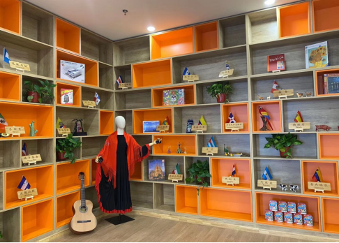 展示区:以展柜为平台,通过对西班牙语国家和地区历史、文化及特色的展示,让学生近距离接触和领略西语国家的风采。配合《西班牙语国家概况》和《拉丁美洲文化概况》等相关课程,增强学生的参与度和兴趣感,提高授课质量。