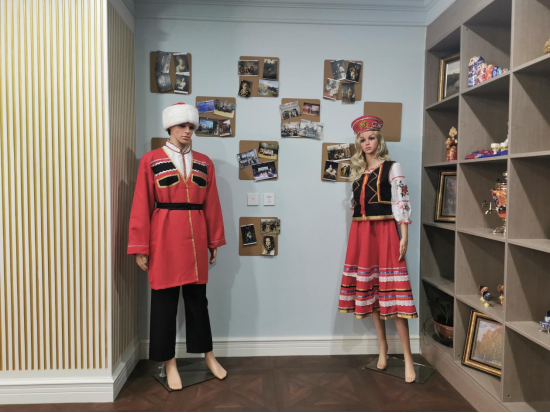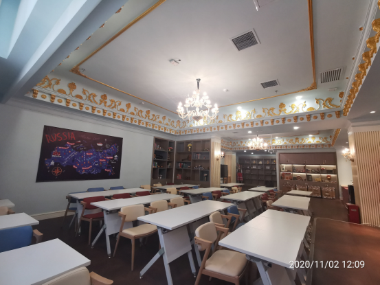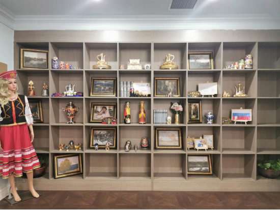 文化展示区内陈列的是独具特色的俄罗斯物品,例如:俄罗斯服装、工艺品、油画、图书等。进入该区立刻就能引起学生对俄罗斯异国文化的喜爱,引起学习俄语和了解俄罗斯国情文化的兴趣,开拓学生视野,丰富知识储备。该区可开设俄罗斯文化国情课、俄罗斯文学课等。