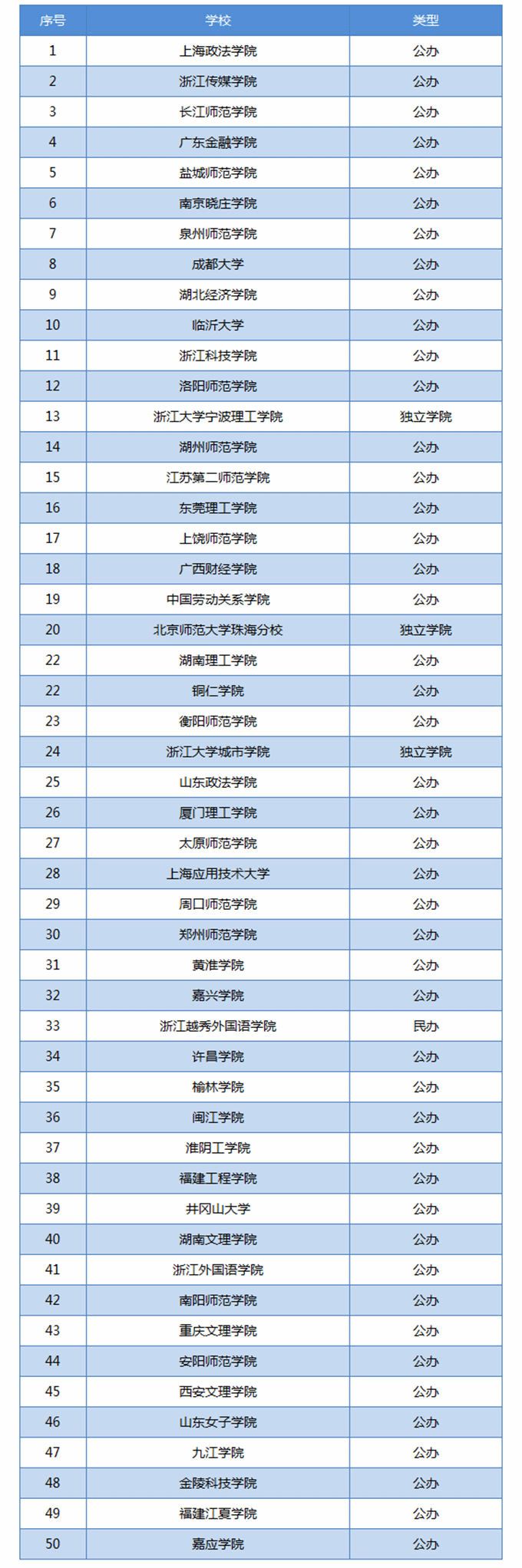 我国新建(应用型)本科高校“中文社会科学引文索引”(CSSCI)论文排行榜前50强一览表