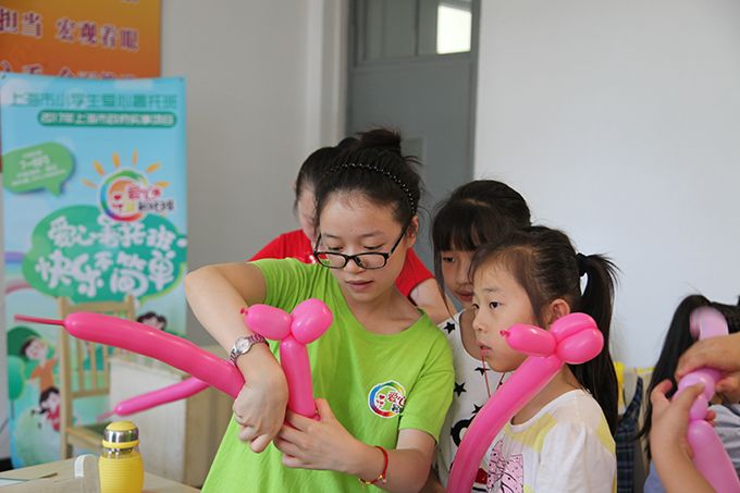 在上海市金山区廊下镇“爱心暑托班”办班点辅导孩子做手工