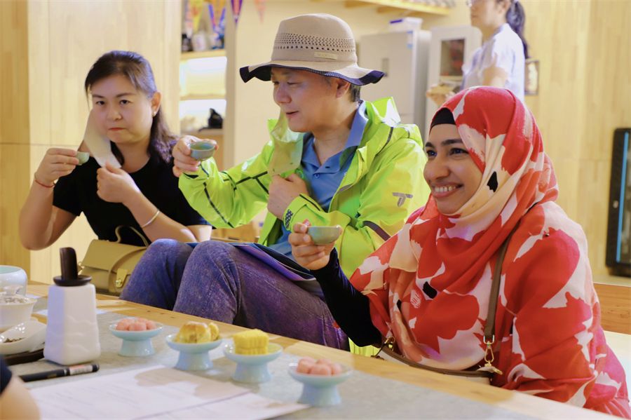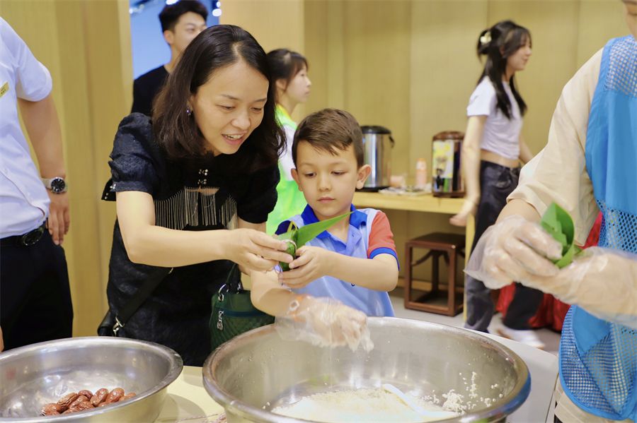 在外国语言与文化实践教学中心的中华文化体验馆、法国文化体验馆、西班牙文化体验馆、日本文化体验馆、韩国文化体验馆等,安排了汉服穿着体验、茶文化体验、书法临摹、投壶、剪窗花、中国传统文化知识问答等系列活动,吸引了众多外国专家及亲属的踊跃参与;同时,在西区小剧场还安排了包粽子体验及品赏粽子、绿豆糕、雄黄酒等端午节特色玉食琼酿,旨在让嘉宾们充分感受和了解中国端午礼俗及文化。