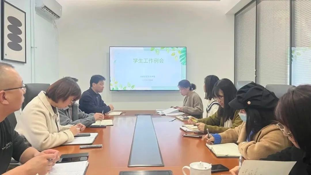 11月8日上午,亚欧语言文化学院召开学生工作例会,学院党委书记、副院长宇文永康,学工办主任尹娜,团总支书记陈福礼及全体辅导员参会。