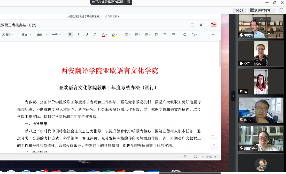 之后,李庆明院长重点解读了《亚欧语言文化学院教职工年度考核办法(试行)》的修订目的及总体情况。他指出,根据学校相关政策,结合亚欧语言文化学院的工作实际及今后发展规划,本着强化竞争激励机制,激励广大教职工更好地履行岗位职责,不断推进学院人才培养、科学研究、社会服务等各项工作有效开展的目的,学院领导班子起草修订了新一版考核办法。会上大家畅所欲言,提出很多建设性意见,以进一步增强考核办法的可行性。会后将由综合办牵头修改,并由各部门主任组织召开部门会议,征求全院教职工意见。