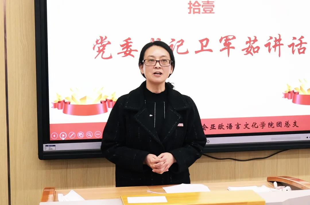 大会第六项:党委书记卫军茹讲话,她表示,此次换届大会是团总支总结经验、谋划未来、开拓创新的大会,她代表亚欧语言文化学院党委向我院团总支换届选举大会的胜利召开和新一届当选的团总支委员及学生干部们表示热烈地祝贺。她提到,在庆祝中国共产党成立100周年大会上,习近平总书记强调:“未来属于青年,希望寄予青年。”并对新时代的青年发出号召:“新时代的中国青年要以实现中华民族伟大复兴为己任,增强做中国人的志气、骨气、底气,不负时代,不负韶华,不负党和人民的殷切期望!”。所以,她也代表亚欧院党委给新一届的团干部及全体团员青年们提出以下三点希望:坚定理想信念,在学思践悟中勇担责任与使命;刻苦学习、练就过硬本领,积极投身强国伟业;不负韶华,奋发有为,继续引领和做好团的工作。最后,她希望我院团员青年志存高远、脚踏实地,珍惜韶华、勇担责任,在开拓创新中增长才干,积极引领广大青年学生感悟时代、紧跟时代,努力实现人生价值!