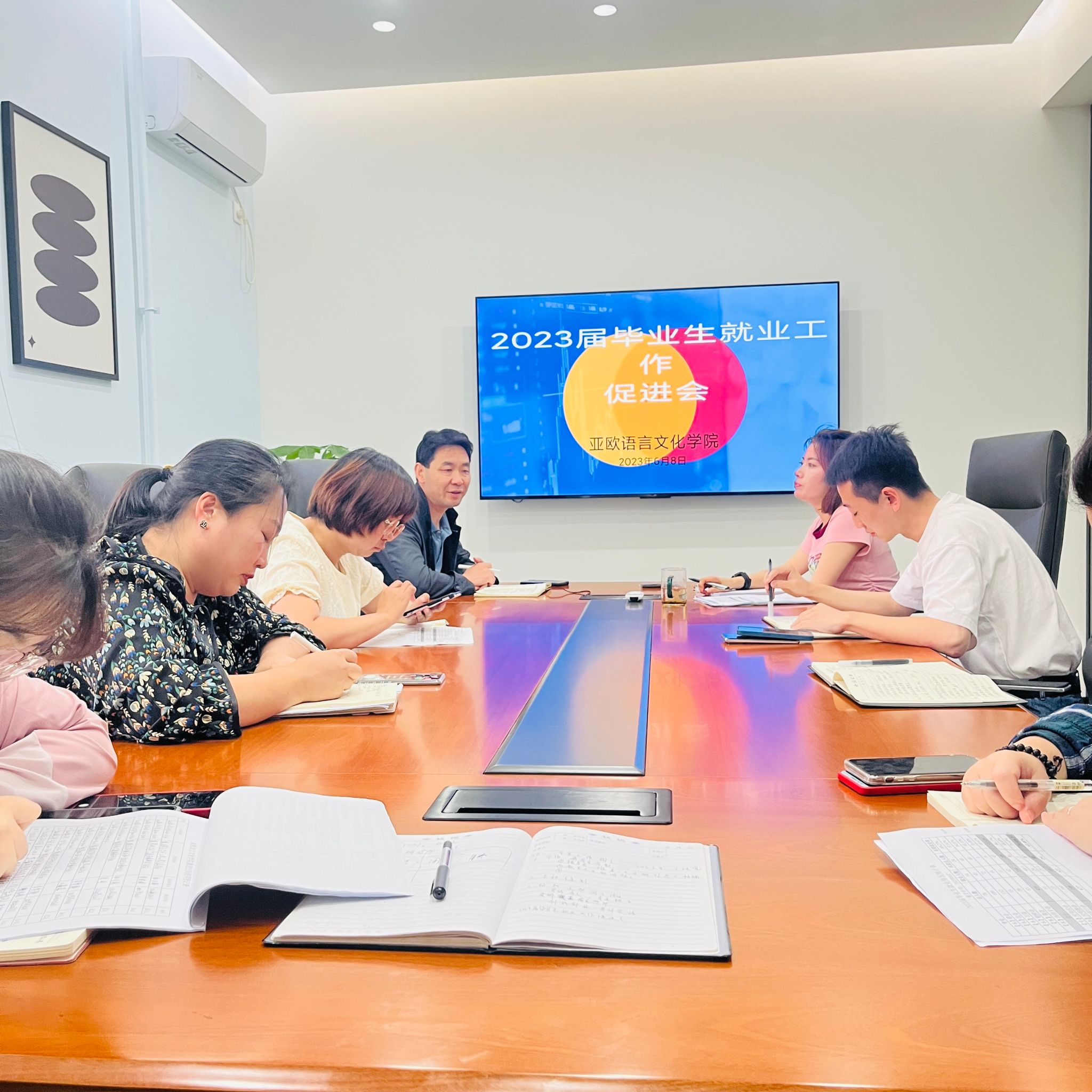 为加快2023届毕业生就业工作,6月8日,亚欧语言文化学院在三号楼创咖会议室召开2023届毕业生就业工作促进会,亚欧语言文化学院党委书记、副院长宇文永康,学工办主任尹娜,团总支书记陈福礼及全体辅导员参会。
