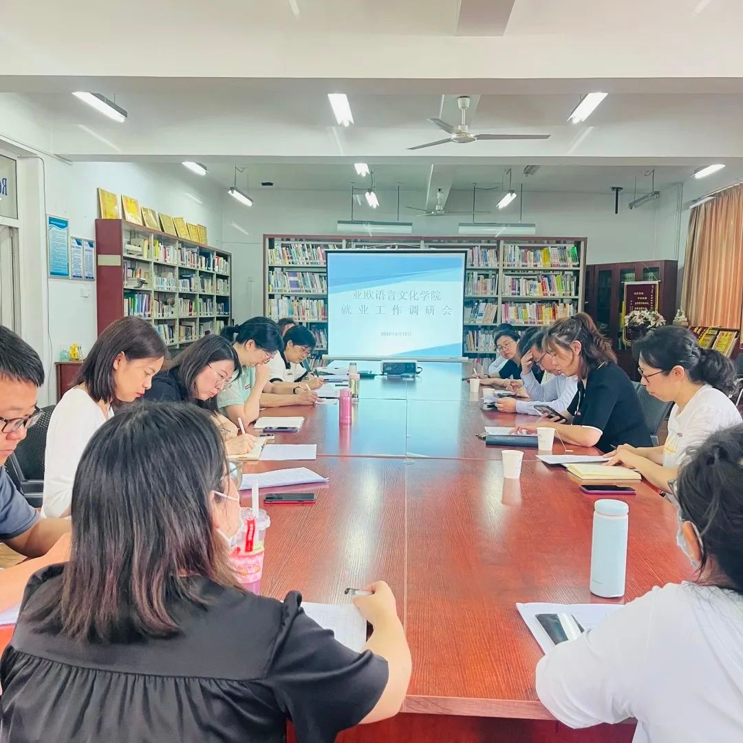为深入了解亚欧语言文化学院2023届毕业生就业落实情况,推进毕业生高质量充分就业,6月12日下午,党委副书记、副校长郭炜深入亚欧语言文化学院召开就业工作调研会。亚欧语言文化学院院长李庆明,大学生就业创业服务中心处长陈潇,国际交流与合作处处长王明明,亚欧语言文化学院副院长吴震、魏海燕,各系主任及部分教师代表参会。