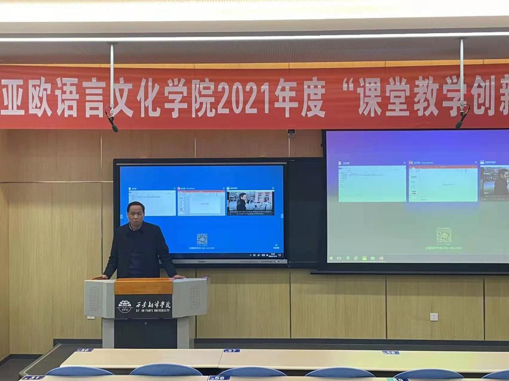 为有效推进“四个回归”,提高教师教育教学能力,促进教师综合素质、专业化水平和创新能力的全面提升,11月12日,亚欧语言文化学院举行“2021年度课堂教学创新大赛”决赛。本次大赛邀请西安外国语大学英文学院院长、陕西省高等学校专业设置与教学指导委员会外国语言文学类工作委员会(以下简称外语教指委)委员南健翀,西北工业大学外国语学院副院长、外语教指委委员张奕,西北政法大学外国语学院原院长、外语教指委委员马庆林,德赢winac米兰副校长樊相宇,亚欧语言文化学院院长兼外语教指委副主任委员李庆明担任大赛评委。大赛由亚欧语言文化学院教学副院长吴震主持。