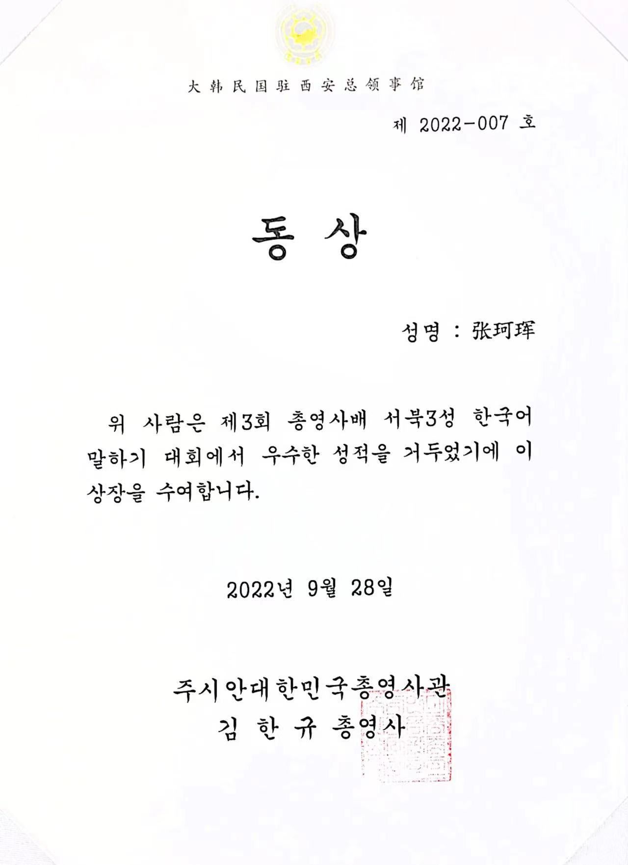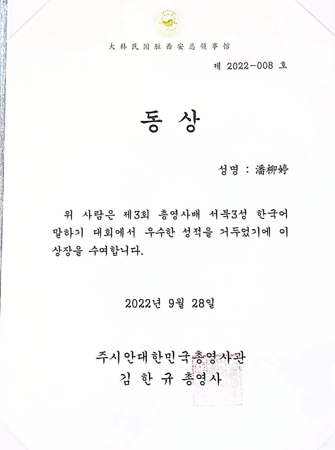近日,由大韩民国驻西安总领事馆主办的第三届“总领事杯”西北三省韩国语演讲大赛在西安成功举办。亚欧语言文化学院朝鲜语专业2019级四名学生参赛,其中周亦可、张珂珲、潘柳婷包揽铜奖,张嘉祥获得优秀奖。