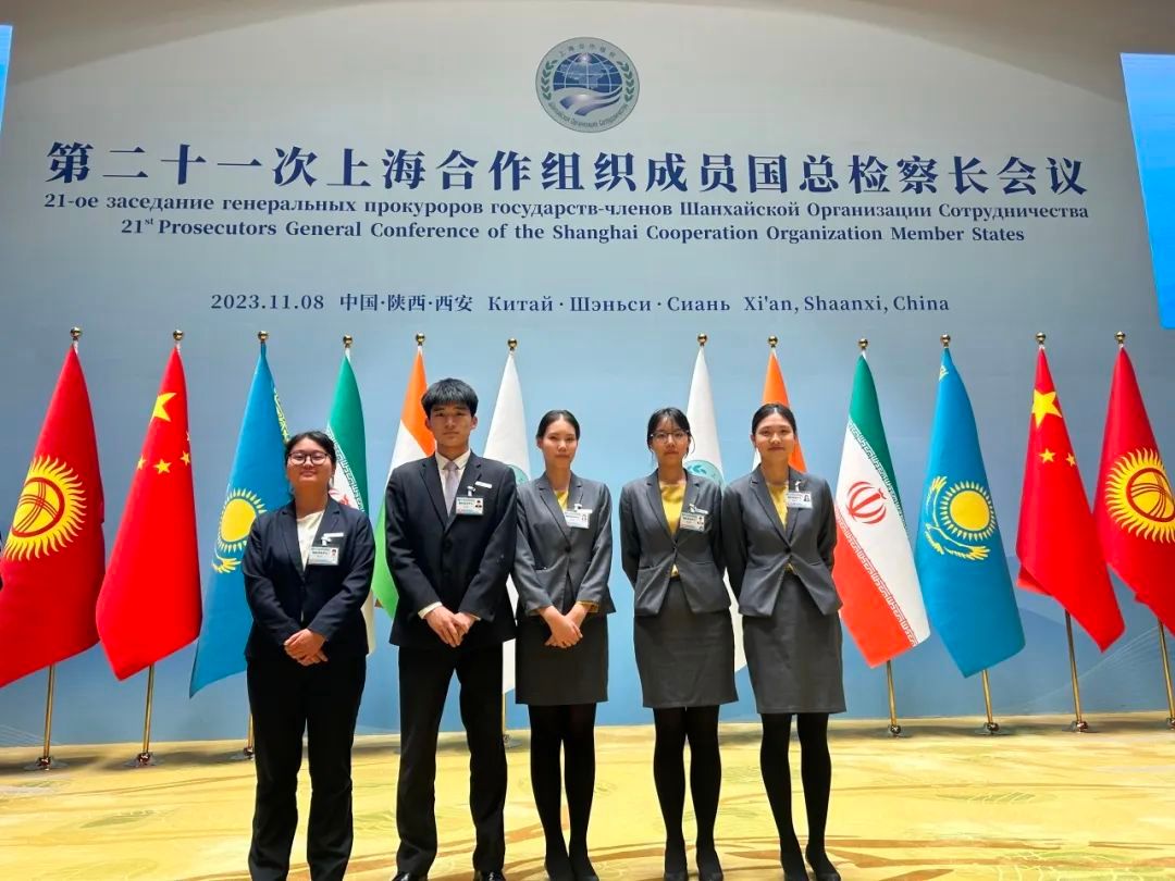 亚欧语言文化学院俄语专业2021级学生李佳宜、李晓、李嘉俊、吴燕妮及2022级学生梁莹莹、遆思怡、郏冰冰、刘畅通八名同学经过前期层层筛选,参加了第二十一次上海合作组织成员国总检察长会议的志愿服务工作。