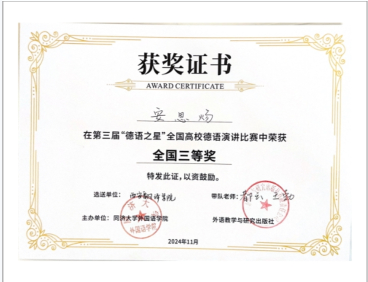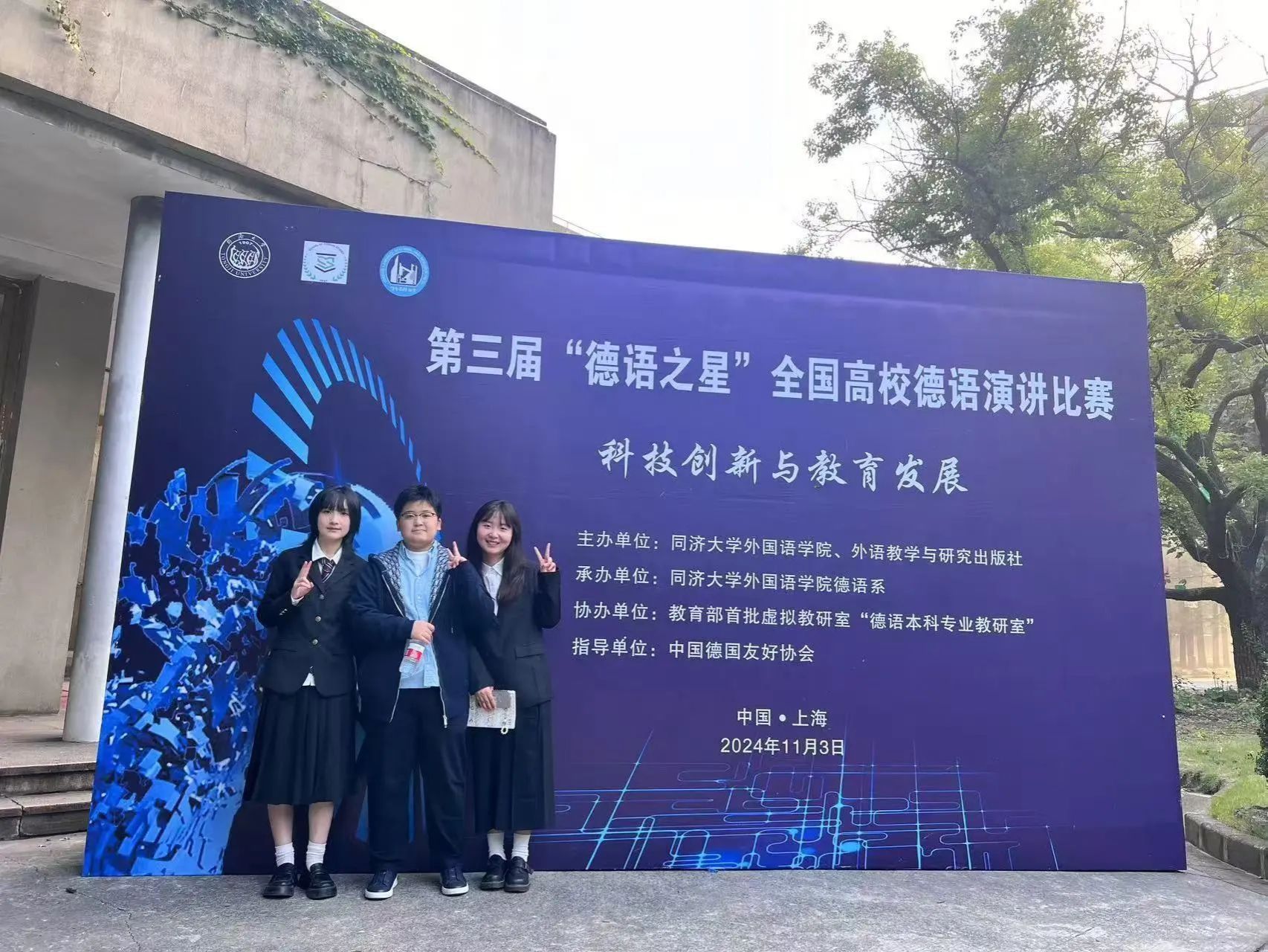 11月3日,由同济大学外国语学院和外语教学与研究出版社联合主办,同济大学外国语学院德语系承办,教育部首批虚拟教研室“德语本科专业教研室”协办,中国德国友好协会指导的第三届“德语之星”全国高校德语演讲比赛决赛在经历一上午的紧张比赛后顺利结束。德赢ac米兰官方合作德语系学生安思炀、张欣蕾和赵亚轩在激烈竞争中脱颖而出,与北京大学、北京外国语大学等15支来自“985”和“211”高校的队伍同台竞技,最终荣获本次比赛的三等奖。此次比赛的结果充分展现了我校德语学子出色的德语演讲能力和文化素养。