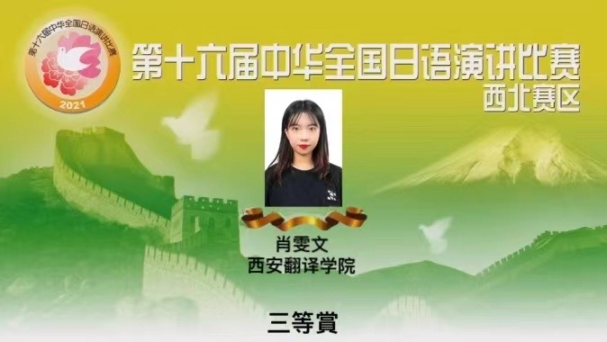 2021年11月27日,第十六届中华全国日语演讲比赛西北赛区预赛在西安外国语大学举办。我校亚欧语言文化学院2020级日语专业肖雯文同学在比赛中荣获三等奖。
